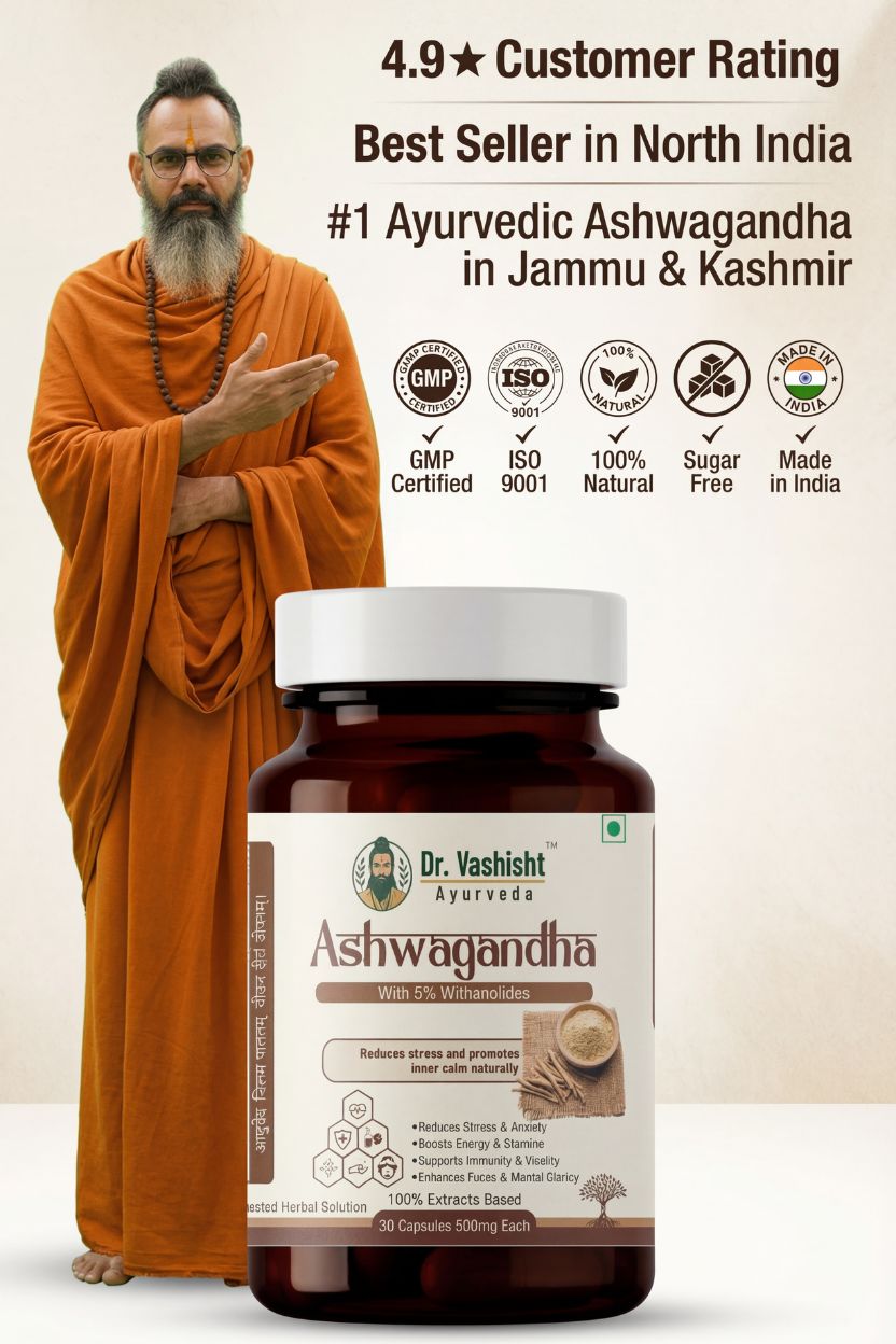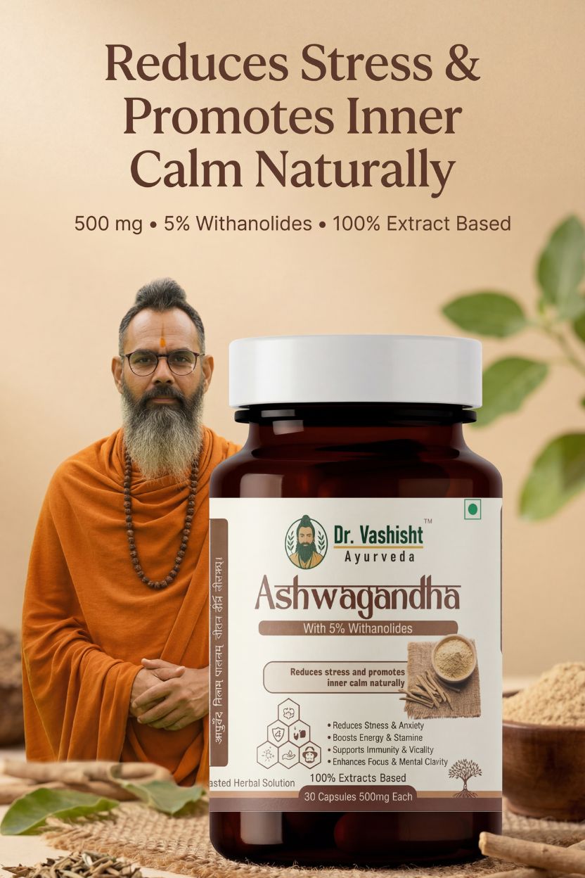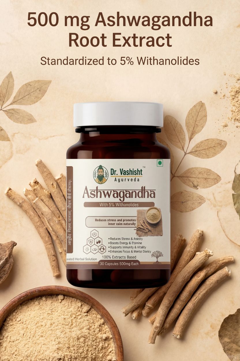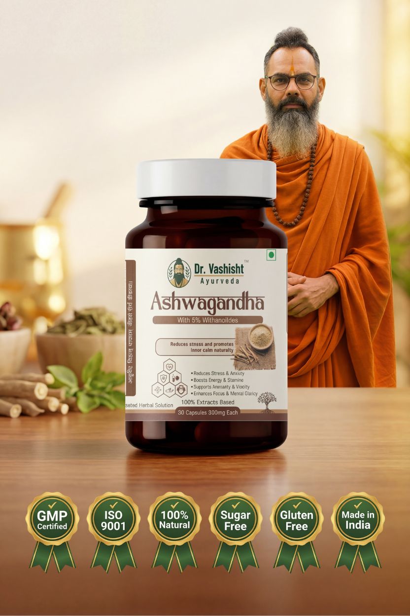 Dr. Vashisht Ayurveda Ashwagandha Capsules are crafted using high-quality Ashwagandha extract standardized to 5% Withanolides, ensuring purity, potency, and consistent results. Known as a powerful adaptogenic herb in Ayurveda, Ashwagandha helps the body cope with stress while supporting energy, immunity, and mental clarity.