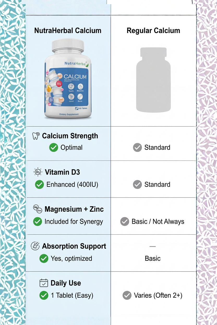 NutraHerbal Calcium Tableta are specially formulated to support strong bones, healthy joints, teeth strength, and muscle function. This advanced formula combines Calcium, Magnesium, Zinc, and Vitamin D3, ensuring superior absorption and long-term skeletal support.