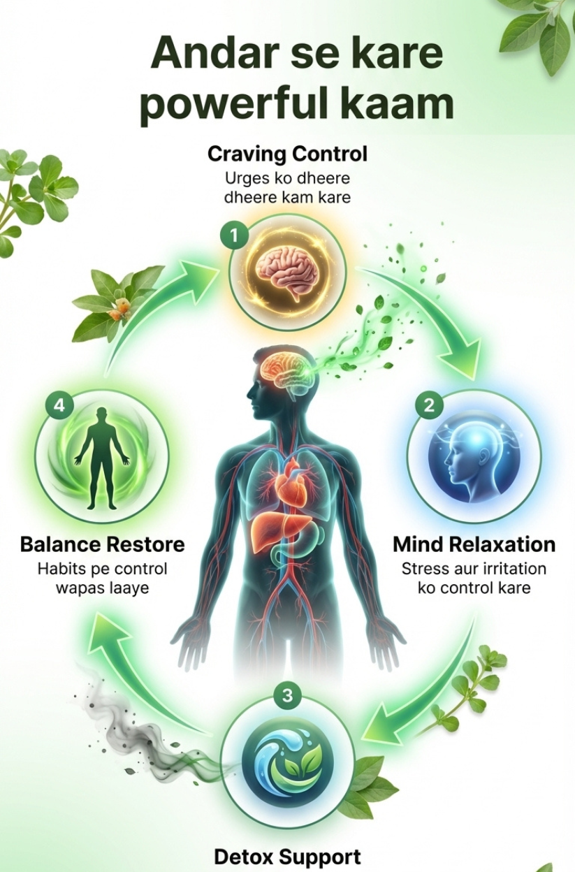 यह तंबाकू और शराब की आदत को नियंत्रित करने में हर्बल सपोर्ट प्रदान कर सकता है।