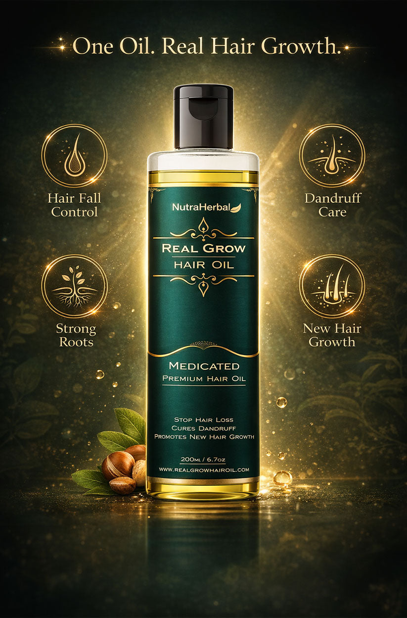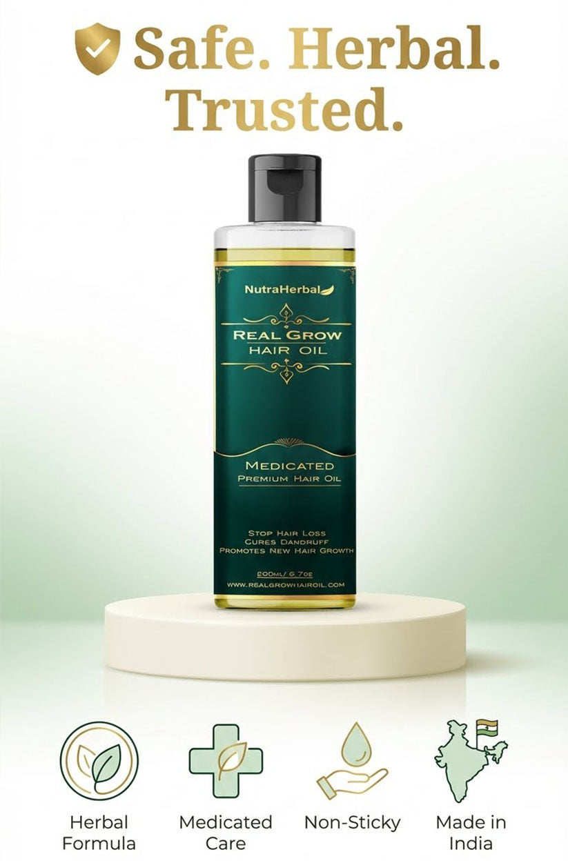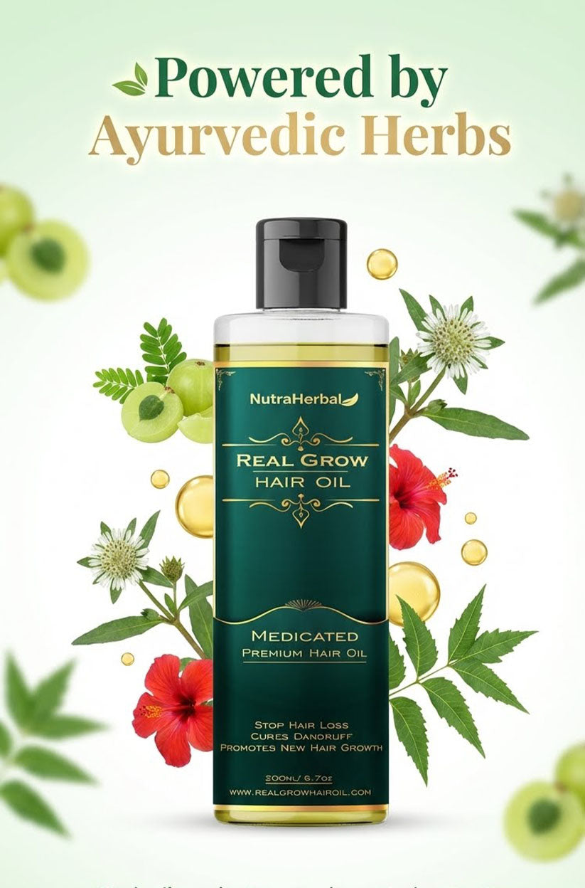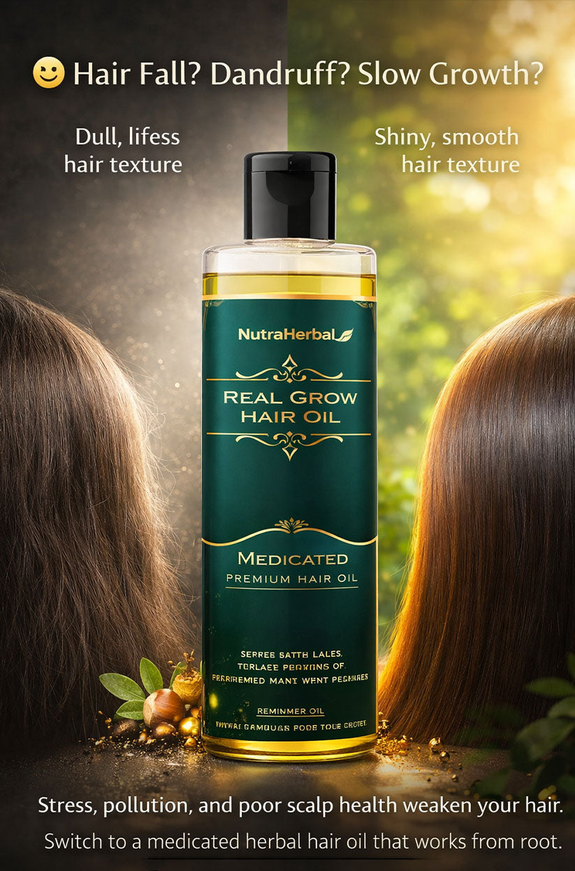 NutraHerbal Real Grow Hair Oil is a premium Ayurvedic hair care solution designed to address the root causes of hair fall, dandruff, and scalp dryness. Instead of temporary cosmetic fixes, this oil works deeply on the scalp to nourish hair follicles and support long-term hair health.