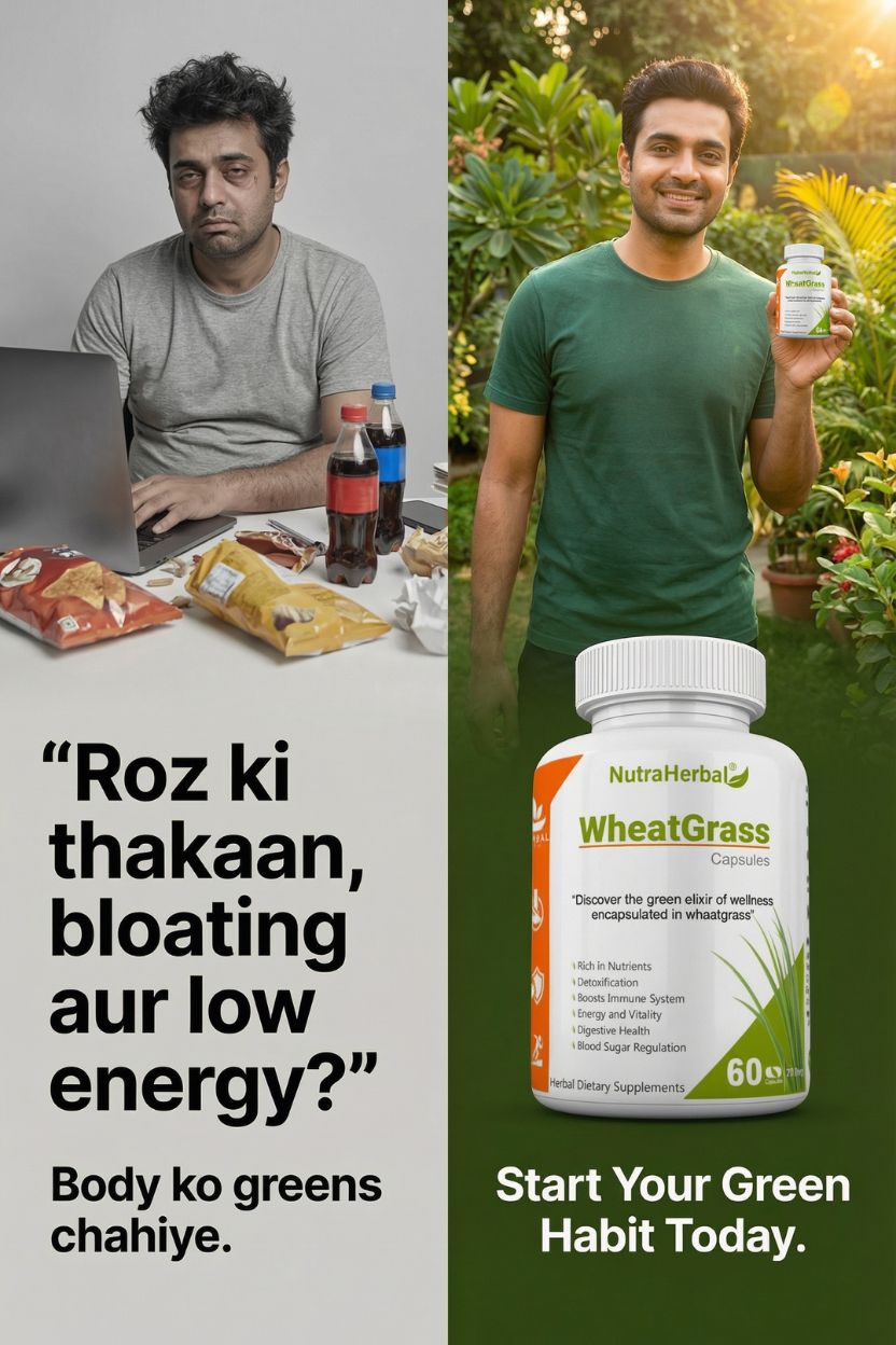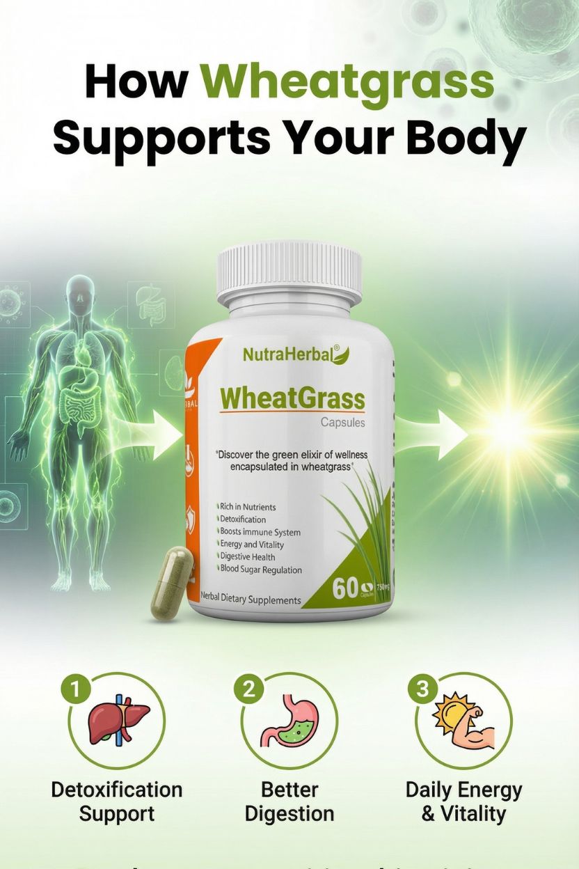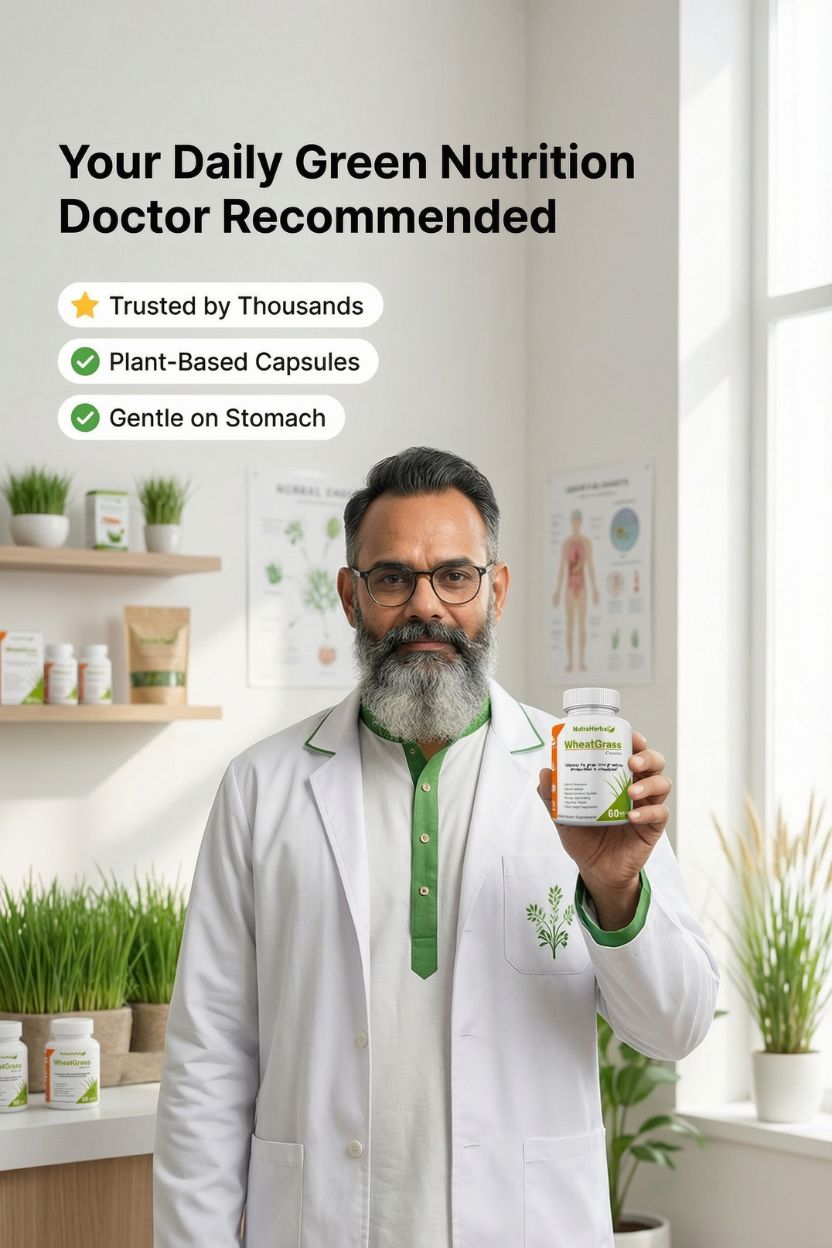 NutraHerbal Wheatgrass Capsules are a premium Ayurvedic wellness supplement designed to support daily detox, immunity, digestion, and natural energy. Made from carefully sourced wheatgrass, these wheat grass capsules are rich in chlorophyll, vitamins A, C, E, iron, magnesium, amino acids, and antioxidants, making them a complete green nutrition solution.